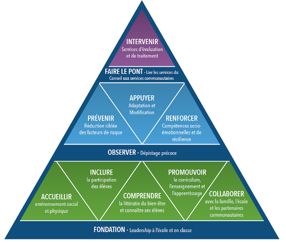 Nous favorisons un modèle harmonisé et intégré pour le bien-être et la santé mentale des élèves. Une approche de soutien échelonnée est un moyen d’organiser les stratégies et initiatives pour assurer que celles-ci touchent tous les niveaux d’interventions dans chaque école et dans chaque classe.